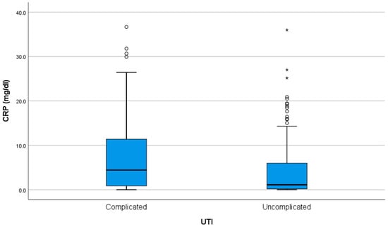CRP levels at admission in children with complicated versus uncomplicated urinary tract infections (UTIs). The interior bars indicate the medians while the whiskers extend to the maximum and minimum of the data; ◦ = outlier; * = far outlier.