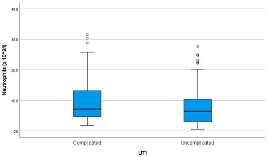 Neutrophil count at admission in complicated versus uncomplicated UTIs. ◦ = outlier.