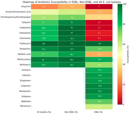 In the ESBL-producing group, resistance to beta-lactams was widespread. All isolates were resistant to ampicillin, and 89.4–97.9% were resistant to first- and third-generation cephalosporins. Amoxicillin/clavulanic acid and trimethoprim/sulfamethoxazole were also largely ineffective; fosfomycin retained full activity (100% susceptible). High susceptibility was also observed with carbapenems (imipenem and meropenem: 93.6% each) and selected aminoglycosides, particularly amikacin (85.1%). Cefoxitin and nitrofurantoin showed good activity, with efficacy rates of 89.4% and 85.1%, respectively