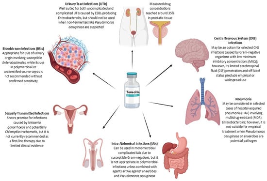 Summary of temocillin use across infection types. The figure outlines the clinical applicability of temocillin in various infectious disease settings (generated with BioRender.com, accessed 9 July 2025; available at https://biorender.com/).
