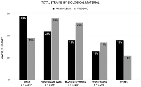 Frequency of Carbapenem-Resistant Klebsiella spp. Isolates per Clinical Sample: Pre-Pandemic vs. Pandemic Periods. (*) Statistically significant results.