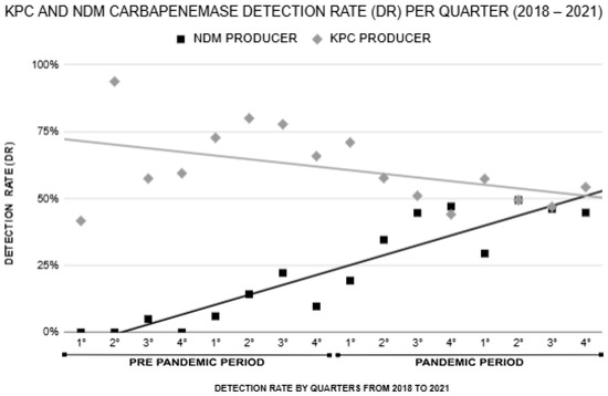 Time trend pattern for blaNDM and blaKPC detection rate by quarter from 2018 to 2021.