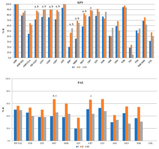 Profiles of antibiotic resistance of KPN, PAE, and ABA. *—p < 0.05. AMP—ampicillin, AMP-SUL—ampicillin–sulbactam, AMO-CLA—amoxicillin–clavulanic acid, PIP-TAZ—piperacillin–tazobactam, CFT—ceftriaxone, CFD—ceftazidime, CEF—cefepime, AZT—aztreonam, IMI—imipenem, MER—meropenem, ERT—ertapenem, CIP—ciprofloxacin, LEV—levofloxacin, NOR—norfloxacin, AMI—amikacin, GEN—gentamicin, TOB—tobramycin, TIG—tigecycline, FOS—fosfomycin, TMP-SMX—trimethoprim/sulfamethoxazole, COL—colistin. a—ΔII/I, b—ΔIII/I, c—ΔIII/II.