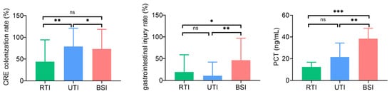 Representative differences in clinical and laboratory features among RTI, UTI, and BSI patients. Bar chart showing the CRE colonization rates, gastrointestinal injury rates, and PCT levels in RTI, UTI, and BSI groups. Data are presented as mean and SD. * p < 0.05; ** p < 0.01; *** p < 0.001; ns, not significant.