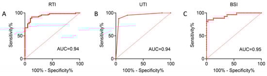 ROC curves of logistic regression models evaluating the predictive performance for CRE infection in RTI/UTI and BSI groups (A–C). The AUC values are shown, indicating the discriminative ability of each model.