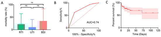 Mortality and prognostic analyses in patients with CRE infections. (A) Mortality rates among patients with RTI, UTI, and BSI, shown as bar charts. ns, not significant. (B) ROC curve of the logistic regression model predicting mortality in CRE-infected patients, with the AUC indicating discriminative performance. (C) Kaplan–Meier survival curve of CRE-infected patients based on in-hospital mortality (censored at discharge), with 95% CI shown.