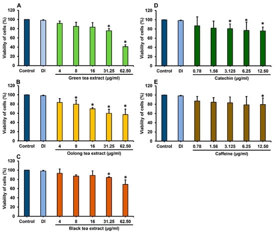 Viability of Caco-2 cells after treatment with green tea (A), oolong tea (B) and black tea (C) extracts and phytochemical compounds of catechin (D) and caffeine (E) for 48 h. * Data are significantly different compared to control cells (p < 0.05). Values are presented as mean ± standard deviation; n = 3 samples. Deionized water (DI) was used as a vehicle control.