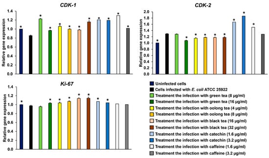 Expression of CDK-1, CDK-2, and Ki-67 genes associated with the cell cycle in Caco-2 cells following infection with colibactin-producing E. coli and treatment with tea extracts and compounds. * Data are significantly different compared to cells infected with E. coli ATCC 25922 (p < 0.05). Values are presented as mean ± standard deviation; n = 3 samples. Statistical analysis between groups was performed using one-way ANOVA and Tukey’s test for multiple comparisons.