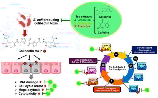 This study highlights the potential of tea extracts, particularly green tea, oolong tea and black tea, and tea compounds (catechin and caffeine), as natural agents for combating bacterial infections, specifically those caused by E. coli ATCC 25922, a colibactin-producing strain. These tea extracts and tea compounds demonstrated significant antimicrobial activity against E. coli-producing colibactin toxins. Furthermore, tea extracts and catechin protected colon cells (Caco-2) from cytopathic effects, including megalocytosis and cell debris, induced by E. coli ATCC 25922 infection. All tea extracts and tea compounds also promoted higher cell viability and reduced DNA damage caused by colibactin-induced double-strand breaks. In terms of the cell cycle, the study revealed that E. coli ATCC 25922 downregulated CDK-1 and upregulated CDK-2 in Caco-2 cells, leading to cell cycle arrest and increased DNA damage. Interestingly, treatment with tea extracts and tea compounds restored normal cell cycle function by upregulating CDK-1 and suppressing CDK-2 expression, while tea extracts and catechin promoted cell proliferation via Ki-67 expression (Figure 5). Overall, this research demonstrates the therapeutic potential of tea extracts as a natural alternative to synthetic antimicrobial agents. They not only inhibit bacterial infection but also protect host cells from the detrimental effects of E. coli-producing colibactin toxin, making them promising candidates for future treatment strategies against bacterial infections and related diseases.