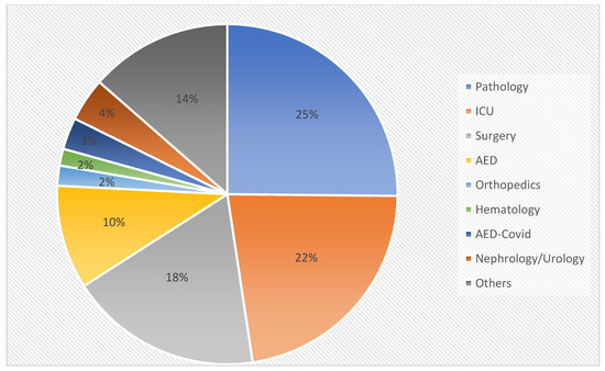 Distribution of carbapenemase-producing P. aeruginosa isolates by hospital department.
