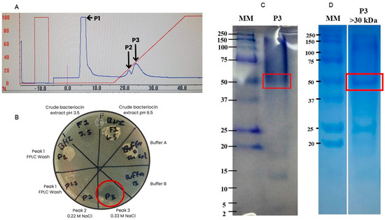 The BLIS-67 was purified by FPLC, and only two peaks were detected, one at 0.22 and another at 0.33 M of NaCl (Figure 1A). Figure 1B shows the evaluation of the antagonistic activity against L. monocytogenes of peaks at 0.22 M (P2) and 0.33 M (P3) of NaCl, as well as the wash peak (P1). Moreover, Buffer A and B, as well as crude bacteriocin extract (BLIS-67), were used as negative and positive controls, respectively. In this Figure, it can be observed (red circle) that only P3 showed antagonistic activity. Figure 1C shows two main protein bands in the active fraction obtained by ion exchange chromatography: one with an approximate experimental molecular mass of 50 kDa and another of 14 kDa, according to the protein molecular weight marker. Figure 1D shows the protein band of interest after being separated using a 30 kDa cut-off microfilter. It is worth mentioning that both filtered fractions, <30 and >30 kDa, retained their antagonistic activity against L. monocytogenes.
