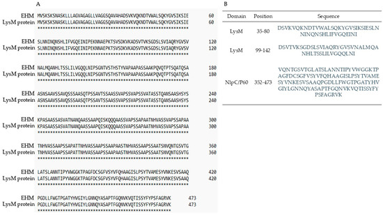 BLASTp analysis of the amino-acid sequence of EHM (47 kDa) yielded a high percentage of identity with several sequences reported as peptidase proteins of the C40 family of P. acidilactici species, with a 100% query cover. The C40 family peptidase protein with 100% identity (GenBank: WP_022831970.1) was searched in the UniProt database, where it was identified as “an inferred from homology protein” with a lysozyme motif domain (LysM) previously reported in P. acidilactici (UniProt: E0NEA3). This sequence was aligned to the amino acid sequence of EHM from E. lactis-67 using Clustal Omega software (version 1.2.4), and it was observed that both sequences were completely identical (Figure 2A). Hence, EHM had a 100% identity with the LysM protein reported for P. acidilactici. Moreover, the LysM protein of P. acidilactici presents three domains in its sequence: two LysM domains at the N-terminal, and one NlpC/P60 domain at the C-terminal. These three domains matched in position with the unique peptide sequences detected in the EHM protein from E. lactis-67. Therefore, EHM from E. lactis-67 also have two LysM domains and an NlpC/P60 domain (Figure 2B).