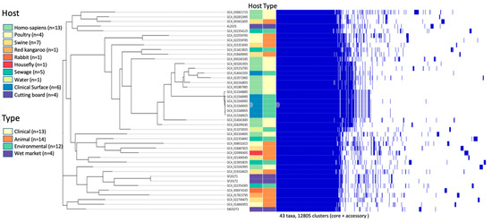 The heatmap identified 12,805 genomic clusters, emphasizing core and accessory genome components. Core clusters exhibit limited variation and are prevalent across most isolates, whereas accessory clusters show greater variability. Environmental and animal isolates exhibit significant heterogeneity in accessory genome content, suggesting adaptation to varying environmental pressures and host environments. Particular attention is drawn to the isolates from wet markets, which form distinct but loose clusters. These isolates exhibit substantial genomic heterogeneity, as highlighted by the heatmap, underscoring the dynamic interchange of genetic material likely facilitated by the diverse microbial and ecological milieu of wet market environments. This heterogeneity is in accordance with the theory that wet markets function as hubs for microbial interchange and development, possibly accelerating the emergence of novel pathogenic variants.