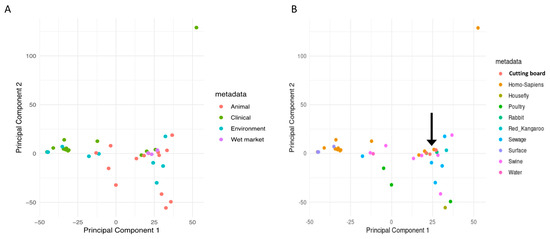 Figure 2. Principal Component Analysis (PCA) showing patterns of gene presence and absence. (A) A PCA plot that shows isolates by their wide ecological niche, such as animal, clinical, environment, or wet market. (B) PCA map with isolates colored by specific sample source, showing more detailed grouping and possible transmission routes (the arrow shows where the cutting board, animal, and sewage isolates overlap).