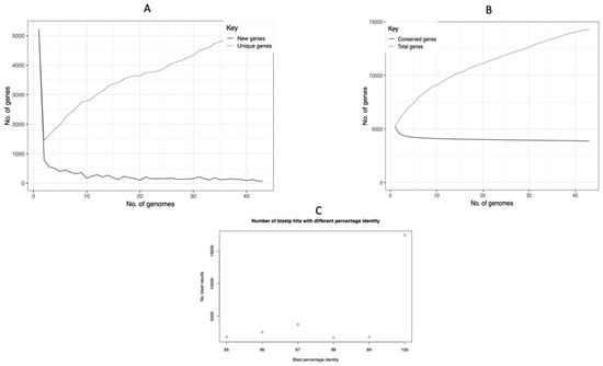 Figure 3. A pan-genome study of 43 Klebsiella pneumoniae genomes. (A) A graph illustrating the quantity of core genes (present in a minimum of 99% of genomic sequences) as a variable of the quantity of genomes incorporated. (B) Pan-genome trajectory illustrating the cumulative quantity of genes (core + accessory) as genomes are incorporated sequentially. This shows that the pan-genome is open. (C) Distribution of BLAST hit identity percentages for all gene sequences, showing that the genomes are very different from one another.