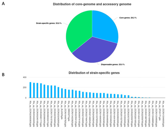 Figure 4. The parts that make up the Klebsiella pneumoniae pan-genome. (A) A pie chart that shows the distribution of core, accessory, and strain-specific genes across the 43 genomes. (B) A bar graph that illustrates the quantity of distinct (strain-specific) genes identified in each of the four wet market isolates (AL202S, SW202T3, SF201T1, and SF201T2).