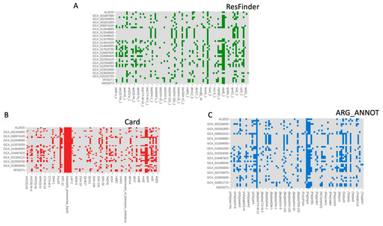 The annotated gbk files from Prokka were screened for antibiotic resistance genes and virulence factors using ABRicate (https://github.com/tseemann/abricate) (accessed on 7 August 2025). The built-in ResFinder 4.1 database was employed to identify acquired resistance genes [30]. Moreover, the Comprehensive Antibiotic Resistance Database (CARD) (https://card.mcmaster.ca) and ARG-ANNOT [31] were employed to meticulously curate the list of genes. This approach ensured the identification of any resistance genes missed by ResFinder, including those with non-synonymous SNPs.