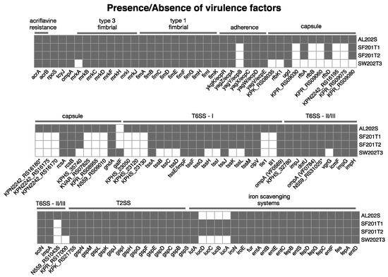 The virulence factor profiles of four Klebsiella pneumoniae isolates (AL202S, SF201T1, SF201T2, and SW202T3) utilizing the VFDB database are presented in Figure 6.