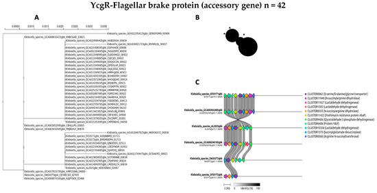 Figure 7. Evolutionary study of the accessory gene ycgR (flagellar brake protein). (A) The ycgR gene sequence’s maximum likelihood phylogenetic tree. (B) Network of co-occurrence for ycgR, where ycgR genes are found together in different genomes. Node size is proportional to the number of shared accessory genes with other nodes in the network. Edges connect genomes that contain the ycgR gene. (C) Synteny plots of the genomic area surrounding ycgR in a selection of isolates, illustrating highly varied flanking regions.