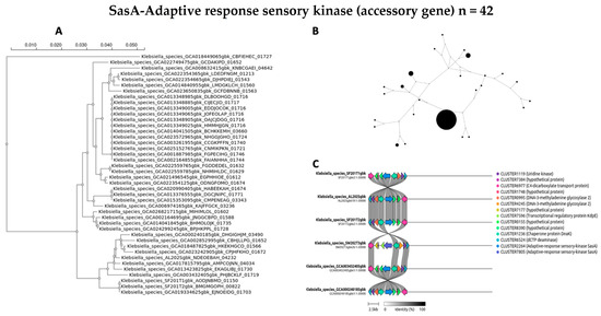 Figure 8. An evolutionary study of the accessory gene sasA (adaptive response sensory kinase). (A) The maximum likelihood phylogenetic tree of the sasA gene sequence. (B) Network of co-occurrence for sasA. Node size is proportional to the number of shared accessory genes with other nodes in the network. Edges connect genomes that contain the sasA gene. (C) Synteny plots of the sasA genomic region, demonstrating a moderate level of conservation in certain isolates.