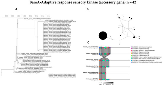 Figure 9. Evolutionary study of the bamA accessory gene (outer membrane protein assembly factor). (A) Maximum likelihood phylogenetic tree of the bamA gene sequence. (B) Network of co-occurrence for bamA. Node size is proportional to the number of shared accessory genes with other nodes in the network. Edges connect genomes that contain the bamA gene. (C) Synteny plots of the bamA genomic area, showing a mix of conservation and change.
