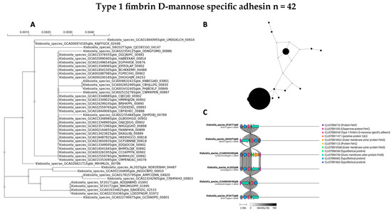 Figure 10. Evolutionary study of the accessory gene fimD (type 1 fimbrial adhesin). (A) Maximum likelihood phylogenetic tree of the fimD gene sequence. (B) Network of co-occurrence for fimD, which shows clusters that are very dense and well-connected. Node size is proportional to the number of shared accessory genes with other nodes in the network. Edges connect genomes that contain the fimD gene. (C) Synteny plots of the fimD genomic area show that most isolates have a very similar genetic background.