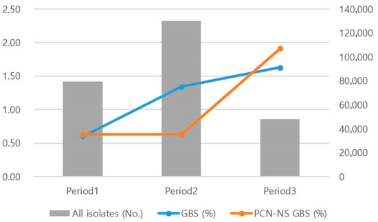 Number of isolates and percentages of Streptococcus agalactiae and penicillin non-susceptible S. agalactiae rates by period. Abbreviation: GBS: group B streptococcus, PCN-NS GBS: penicillin non-susceptible group B streptococcus.