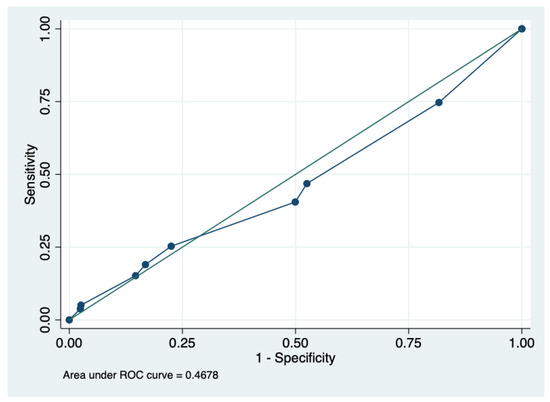 Unfortunately, our results were negative. The performance of the score with a ≥6 cut-off might result in an incorrect decision; however, the overall balance between sensitivity and specificity is poor, and no right cut-off point can be recommended. Moreover, the ROC curve shows that the prediction is not better than chance alone. There is a need for a method to accurately predict whether patients harbor resistant microorganisms [16]. Septic and cancer patients with severe infections rely on an appropriate antibiotic for infection control and survival [17]. High levels of resistance are related to poorer outcomes in Latin American countries [18]. In the context of urinary tract infections, where the risk of mortality is lower than that for other common infections, the risk of using broad-spectrum antibiotics because of a false perception of resistance risk might contribute to further antimicrobial resistance and poorer outcomes. Recent publications have shown that there is no universal benefit of the administration of broader-spectrum antibiotics to patients with severe infections [19]. Treating urinary tract infections with non-susceptible antibiotics might increase the risk of late recurrence but not clinical failure [20,21]. Predicting a low risk of resistance might promote the use of lower-spectrum antibiotics. In the meantime, the use of antibiotics of a lower spectrum in the majority of cases seems to be the right approach. The use of antibiotics with a high concentration in urine, such as cefazoline, cefuroxime, or ceftriaxone [22], has a low risk of failure [20,21,23] and lower risk of affecting the resistance microenvironment of the patient, especially when used for a short period of time [24].