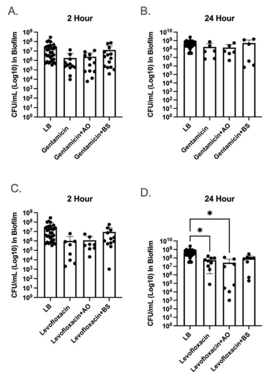 Levofloxacin alone did not significantly reduce bacterial load compared to the LB control at 2 h (p = 0.346) but did show significant reduction after 24 h treatments (p = 0.021) (Figure 1C,D). Although not significant, the combinatorial treatments at 2 h again exhibited an increase in bacterial burden remaining in the biofilm after the 2 h treatment for both α-amylase AO (1.17 × 106 CFU/mL) and BS (9.01 × 106 CFU/mL) compared to levofloxacin (1.0 × 106 CFU/mL) alone. At 24 h, levofloxacin + α-amylase AO exhibited significant reduction compared to the LB control (p = 0.019) but not to the antibiotic alone (p = 0.998), suggesting that α-amylase AO did not improve antibiotic clearance. Similarly to gentamicin, α-amylase AO (2.7 × 107 CFU/mL) reduced the bacterial burden remaining in the biofilm compared the antibiotic alone (5.6 × 107 CFU/mL) while α-amylase BS exhibited an increase in remaining bacteria (8.88 × 107 CFU/mL).