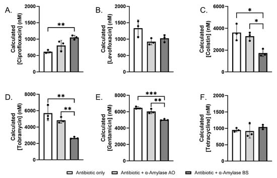 In the absence of amylase, ciprofloxacin levels decreased to 615.3 ± 49.0 nM (Figure 2A). This is consistent with published reports of precipitation of ciprofloxacin in normal saline at 37 °C [56]. Interestingly, co-treatment of α-amylase BS significantly increased ciprofloxacin (1051.2 ± 64.0 nM, p = 0.0049) levels. α-Amylase AO also increased ciprofloxacin levels (805.7 ± 158.6 nM, p = 0.1370), though not significantly. This suggests that α-amylase BS may sequester ciprofloxacin, thereby protecting it from degradation. We also tested levofloxacin and tetracycline, which remained stable under the assay conditions and were unaffected by either amylase (Figure 2B,F). Colistin, on the other hand, exhibited a decrease in concentration in the presence of BS (1740.6 ± 338.1 nM, p = 0.0118), suggestive of antibiotic degradation occurring (Figure 2C). Similarly to colistin, this trend was also observed for tobramycin (2670.2 ± 119.5 nM, p = 0.0016) and gentamicin (5014.2 ± 90.0 nM, p = 0.0002) (Figure 2D,E).