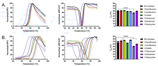 To determine whether antibiotics bind to amylase, we conducted differential scanning fluorimetry (DSF), a biophysical technique to evaluate the stability of protein–ligand and protein–protein complexes [57,58]. DSF is a widely used technique to identify ligands that bind to purified proteins [59,60,61].