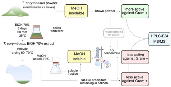 Workflow leading to evaluation of antimicrobial activity and phytochemical characterization of hydroalcoholic extract of T. corymbosus. Extracts were prepared in 70% ethanol and rotovaped at 60–70 °C. To keep drying the extract, methanol was added, producing separation of the extract in a soluble fraction, a brown powder and a tar-like residue. The brown powder turned out to be more active and was further characterized by its antimicrobial activity and phytochemically using HPLC-MS. The three fractions were resuspended in sterile water for antimicrobial activity testing.