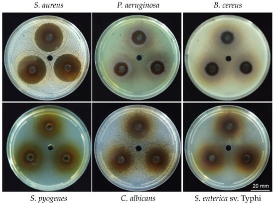 Mueller–Hinton agar (Millipore, Darmstadt, Germany) was prepared by pouring 20 mL of hot medium into 90 mm disposable Petri dishes. After solidification and drying in a culture cabinet, the agar surface was inoculated with a microorganism suspension (McFarland 0.5 in 0.9% NaCl) using a cotton swab and a rotaplate to obtain a uniform lawn. Wells (6 mm) were then punched and filled with 35 μL of either the extract (150 mg/mL of water) or the vehicle (water), as required by each assay. Inhibition zone diameters were measured in three directions after 16 h incubation. Description of the method was previously published [30]. All experiments were performed independently at least three times.