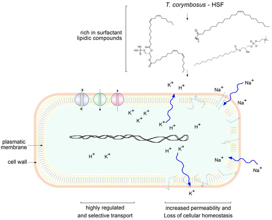 Lipidic compounds found in HSF obtained from T. corymbosus alter membrane permeability. According to results and the literature, lipidic compounds found in plant extracts exert antimicrobial effects by increasing permeability. Zig-zag curved arrows indicate free flow of ions as damage affects cellular homeostasis.