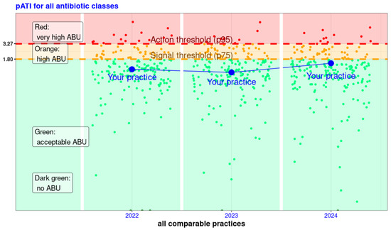 All practices were then split into four categories according to their pATI results and within their practice type: very high ABU (above the action threshold), high ABU (between action and signal thresholds), acceptable ABU (below signal thresholds and not null), and no ABU (null pATI). Classification of practices was then displayed in a graphic, as presented in Figure 1.