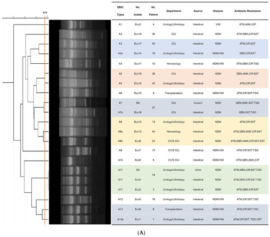 ERIC-PCR typing was performed on 60 isolates, which included 52 colonizing and 8 clinical strains distributed across three species: E. coli (n = 21), K. pneumoniae (n = 28) and E. cloacae (n = 11). The 21 E. coli strains were grouped into thirteen ERIC types (DNA fingerprint similarity ≥ 90%), comprising 15 main clusters (similarity ≥ 80%) and 3 singletons (similarity < 80%) in Figure 2A. Two clinical isolates (M3, M4) were genetically identical (Eco4) or closely related (Eco6) to the intestinal colonizing isolates from the corresponding patient, yet exhibited distinct antimicrobial resistance profiles. Four ERIC types (A3, A5, A8, A13) identified from colonizing isolates showed genetic variations and were distributed across multiple hospital departments.
