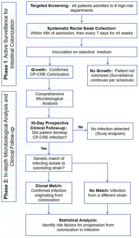 Phase 2: All CP-CRE isolates from colonized patients underwent comprehensive microbiological analysis, including species identification, carbapenemase confirmation, antimicrobial susceptibility testing, and molecular typing (e.g., ERIC-PCR) to assess clonality. Colonized patients were then prospectively followed for 30 days to monitor for the development of any subsequent CP-CRE infection (e.g., bacteremia, pneumonia, UTI). For patients who developed an infection, the infecting isolate was genetically compared to their initial colonizing strain to confirm a clonal link. Finally, statistical analysis was performed on collected clinical and demographic data to identify risk factors associated with the progression from colonization to active infection.