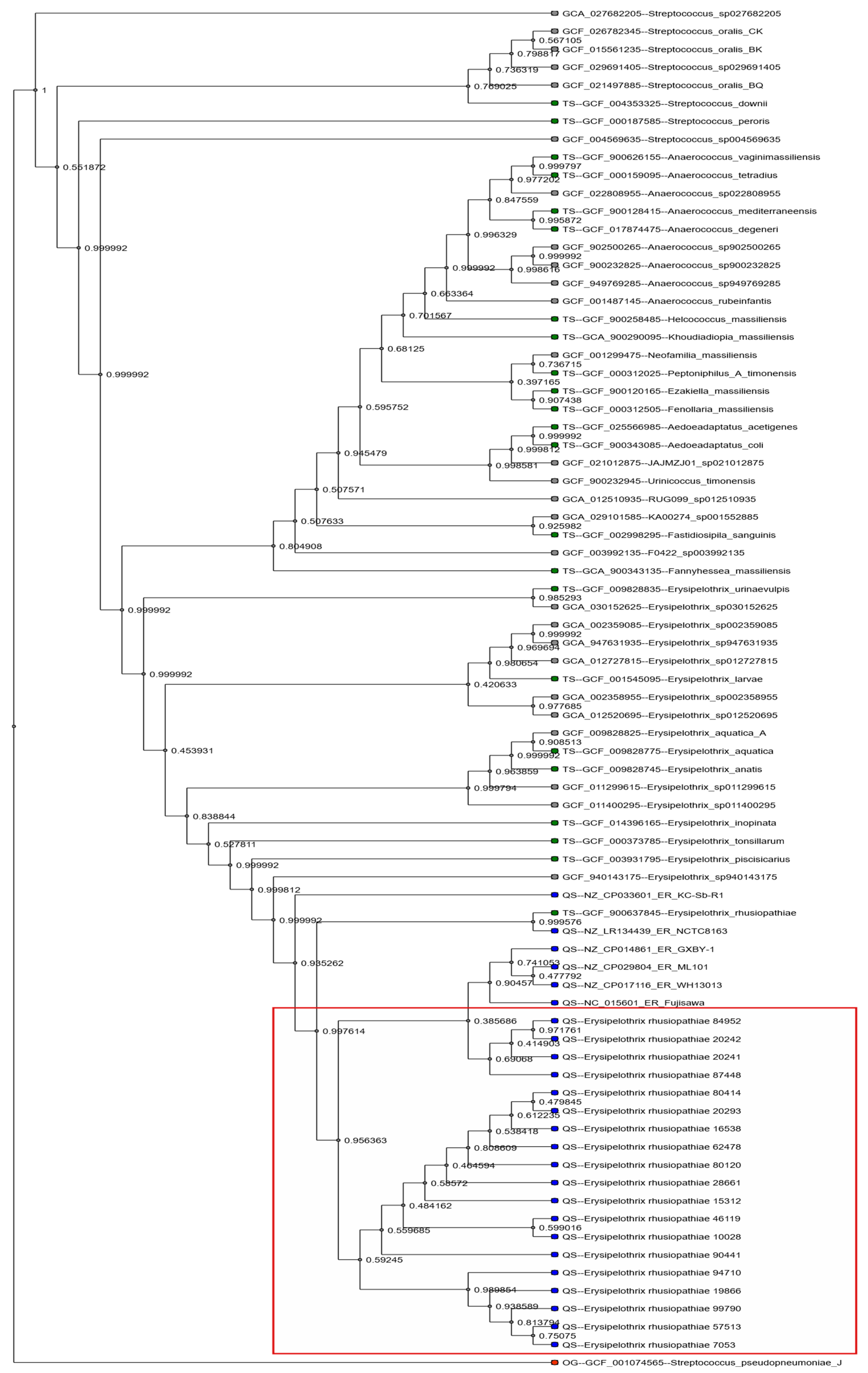 - Söderlund, R.; Formenti, N.; Caló, S.; Chiari, M.; Zoric, M.; Alborali, G.L.; Sørensen Dalgaard, T.; Wattrang, E.; Eriksson, H. Comparative Genome Analysis of Erysipelothrix rhusiopathiae Isolated from Domestic Pigs and Wild Boars Suggests Host Adaptation and Selective Pressure from the Use of Antibiotics. Microb. Genom. 2020, 6, e000412. [Google Scholar] [CrossRef]