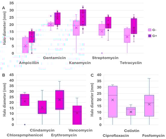 Box˗plot comparing the average values and the range intervals of halo diameters for antibiotics used in both Gram-positive and Gram-negative strains (A), exclusive antibiotics for Gram-positives (B), and exclusive antibiotics for Gram-negatives (C). Box indicates the quartile, and the median is indicated by a line, whilst the average is shown as a cross. Bars indicate the full range of data and circles indicate outliers, whereas crosses represent the median of the data and the horizntal lines represent the average. Data for Gram-negatives are shown in pink color whereas purple was used for Gram-positives.