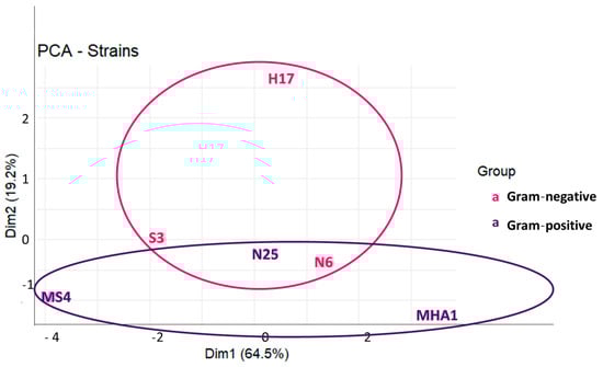 In our study, we have multiple variables, such as 20 different bacteria (10 Gram-negative and 10 Gram-positive) and 5 common antibiotics for both types of bacteria, together with specific antibiotics, determination of halo diameters, and determination of MIC by two different methods (microdilution and agar dilution). In this regard, the multifactorial nature of the data can be simplified by reducing the number of variables to two principal components. The principal components analysis (PCA, Figure 3) indicates that both axes together accounted for 83.7% of the variability, with 64.5% of variability associated with dimension 1 and 19.2% of variability associated with dimension 2. Thus, the reduction in variables did not much affect the representativity of data and the conclusions. On the other hand, the PCA allows visual representation of the distance between samples and also to visualize how the samples can be grouped. We can see that Gram-positive strains were more disperse according to component 1, while Gram-negative strains occupied a central position in the graphic and spanned more regarding component 2. This would suggest different resistance mechanisms in both types of bacteria, since the data of MIC and halos are grouped in a different way in Gram-positives and Gram-negatives. In addition, we can observe superposition of the circles englobing both types of bacteria, which could also suggest the existence of common antimicrobial resistance mechanisms [29].