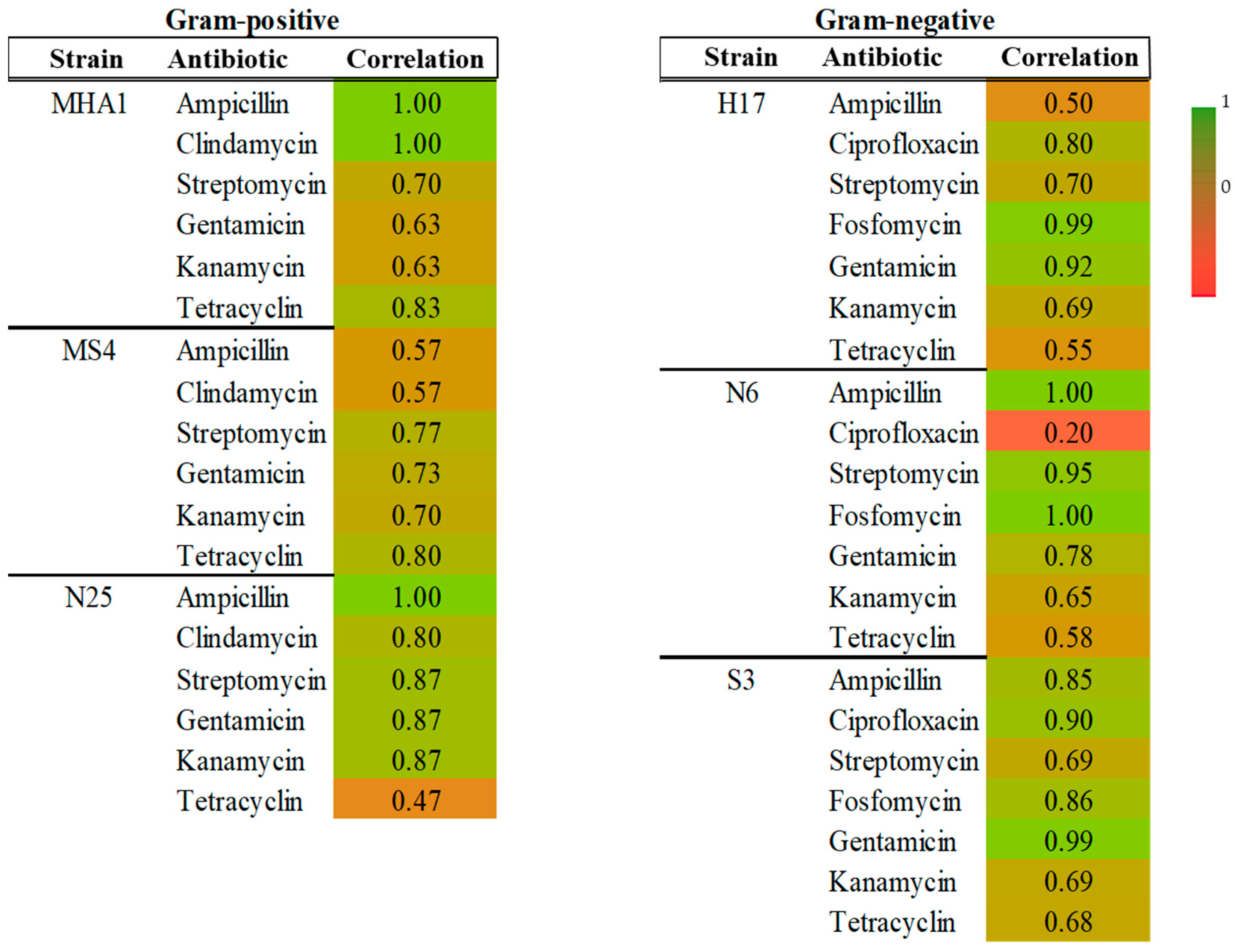 Figure 2 shows a heatmap depicting the correlation between halo diameters and the MIC. The correlations were good in general, with values between 1 and 0.7 for most cases. In general, we can see that there are similar correlation indices in Gram-positive and Gram-negative strains. For Gram-positives, the lowest correlation was found for N25 in tetracycline (0.47) and MS4 for ampicillin and clindamycin (0.57 in both cases). In Gram-negatives, the lowest correlation was found for N6 in tetracycline (0.20).