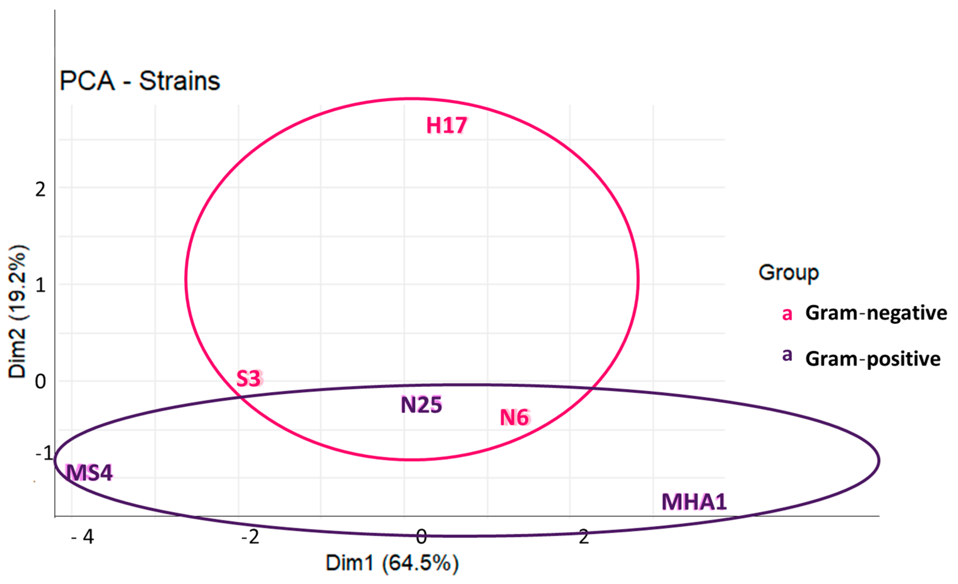 In the next step, we have determined the minimal inhibitory concentration (MIC) to antibiotics of six selected strains, for which we picked three strains among the Gram-positives and three from the Gram-negatives, selecting the most resistant and sensitive strains. Since the sensibility or the resistance depended on every specific antibiotic, we needed a criterion to select the “most sensitive strains” and “the most resistant strains” regarding the whole set of antibiotics. Among Gram-negatives, N6 and H17 were selected, as they were the most antibiotic-resistant bacteria when considering the complete spectrum. As for the most sensitive strains, S3 was selected over N3, as its halo diameters were larger. Among the Gram-positive bacteria, MHA1 was clearly the most resistant strain, followed by N25, and both strains were selected. In contrast, the most susceptible strains were MH6, followed by MR4, MS5, and MS4. However, MS4 was selected for the study over the other candidates due to the difficulty of growing MH6. Finally, the selected strains were N6, H17, S3, N25, MHA1, and MS4.