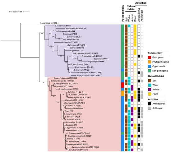 Maximum-likelihood phylogenetic tree based on 16S rRNA gene sequences of Burkholderia species, with Ralstonia solanacearum included as an outgroup. Sequence alignment and phylogenetic reconstruction were performed in MEGA 12 [25] using the Tamura–Nei evolutionary model. The resulting tree was visualized and annotated using iTOL (https://itol.embl.de/ (accessed on 13 October 2025)). Displayed features, including pathogenicity, natural habitat, and biological activities, are species-specific rather than strain-specific. White boxes in the activity column indicate that information is unavailable. Bootstrap support values (>50%) are shown at the corresponding branch nodes. Background shading: lavender/purple represents Paraburkholderia; pink/rose represents Burkholderia.