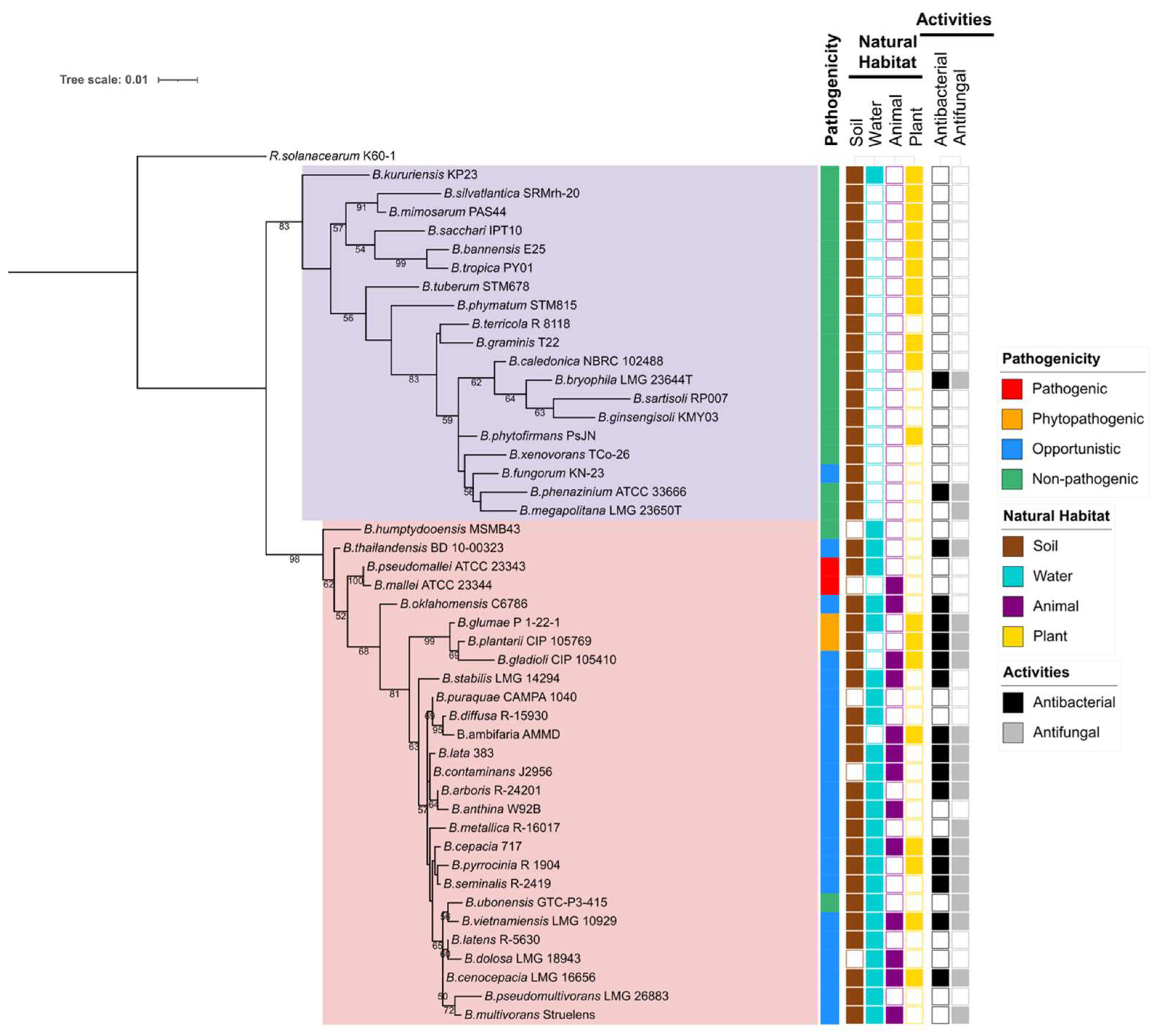 - Yabuuchi, E.; Kosako, Y.; Oyaizu, H.; Yano, I.; Hotta, H.; Hashimoto, Y.; Ezaki, T.; Arakawa, M. Proposal of Burkholderia gen. nov. and transfer of seven species of the genus Pseudomonas homology group II to the new genus, with the type species Burkholderia cepacia (Palleroni and Holmes 1981) comb. nov. Microbiol. Immunol. 1992, 36, 1251–1275. [Google Scholar] [CrossRef] [PubMed]
