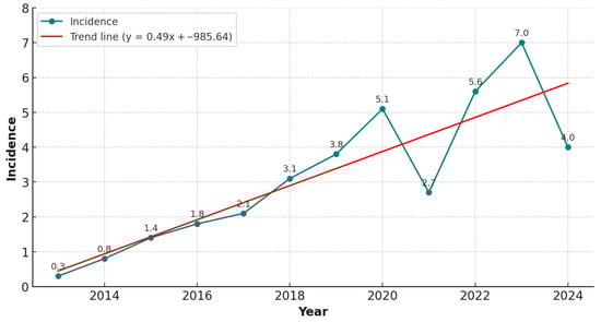 Incidence of CDI cases per 10,000 patient-days from 2013 to 2024, based on data from a previously conducted retrospective observational study (2013–2022) [15] and the present prospective observational study (2022–2024).