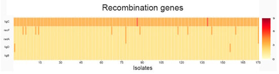 - Manson, A.L.; Cohen, K.A.; Abeel, T.; Desjardins, C.A.; Armstrong, D.T.; Barry, C.E., 3rd; Brand, J.; Chapman, S.B.; Cho, S.N.; Gabrielian, A.; et al. Genomic analysis of globally diverse Mycobacterium tuberculosis strains provides insights into the emergence and spread of multidrug resistance. Nat. Genet. 2017, 49, 395–402. [Google Scholar] [CrossRef]