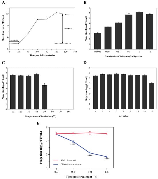 Different MOIs (10−3, 10−2, 10−1, 1, and 10) were examined to determine the optimal MOI for phage infection and replication. The results showed that the phage infection efficiency was the highest at an MOI of 1 (Figure 2B). Therefore, all subsequent stability assays were performed at this MOI. The incubation of phage particles at 10–40 °C for 1 h did not greatly affect the phage titer (~106 PFU/mL, Figure 2C) However, incubation at 50 °C reduced the phage titer to 104 PFU/mL, while incubation at 60–80 °C terminated phage activity (Figure 2C). The phage particles showed excellent stability at pH values ranging between 4 to 11 (phage titer ~106 PFU/mL); however, their titer dropped to 2 × 105 PFU/mL at pH 12 (Figure 2D). Chloroform treatment (5% v/v) significantly reduced phage titer over time (Figure 2E), suggesting that phage particles may be composed of a lipid-based exterior.