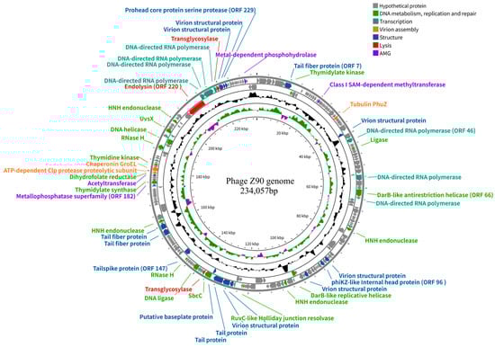 The genomic DNA of the phage Z90 was extracted by the phenol–chloroform method [67]. Briefly, the phage concentrate was mixed with proteinase K (100 mg/mL), Sodium dodecyl sulfate (SDS, 10%, w/v), and Ethylenediaminetetraacetic acid (EDTA, 0.5 mol/L, pH 8.0), and incubated at 65 °C for 3 h. Thereafter, the sample was thoroughly mixed with an equal volume of phenol/chloroform/isoamyl alcohol (25:24:1, v/v/v) and centrifuged at 12,000× g for 10 min. The supernatant was transferred to a fresh tube; this step was repeated twice. For purification of the phage DNA, the supernatant was mixed with chloroform/isoamyl alcohol (24:1, v/v) and centrifuged at 12,000× g and 4 °C for 10 min. The resulting aqueous phase was mixed with isopropanol and incubated at −20 °C for 12 h. The sample was centrifuged at 12,000× g and 4 °C for 5 min, and the precipitate was washed twice with 70% cold ethanol. The pellet was then air-dried, resuspended in 100 μL of Tris-EDTA buffer (10 mM Tris-HCl and 1 mM EDTA, pH 8.0), and stored at −80 °C. The concentration and purity of the extracted DNA were determined using a NanoDrop spectrophotometer (Thermo Fisher Scientific,, Waltham, MA, USA).