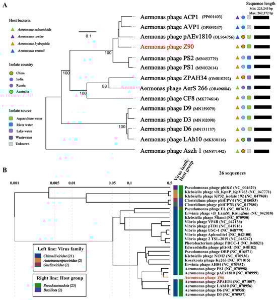 Phylogenetic analysis of the phage Z90 and its related phages (A) Phylogenomic tree = based on the Genome-BLAST distance phylogeny (GBDP) method generated using the Virus Classification and Tree Building Online Resource (VICTOR) tool with the D6 formula. (B) Proteomic tree of the phage Z90 and its related phages generated by Viptree. The viruses were classified according to the ICTV classification system (March 2025 release).