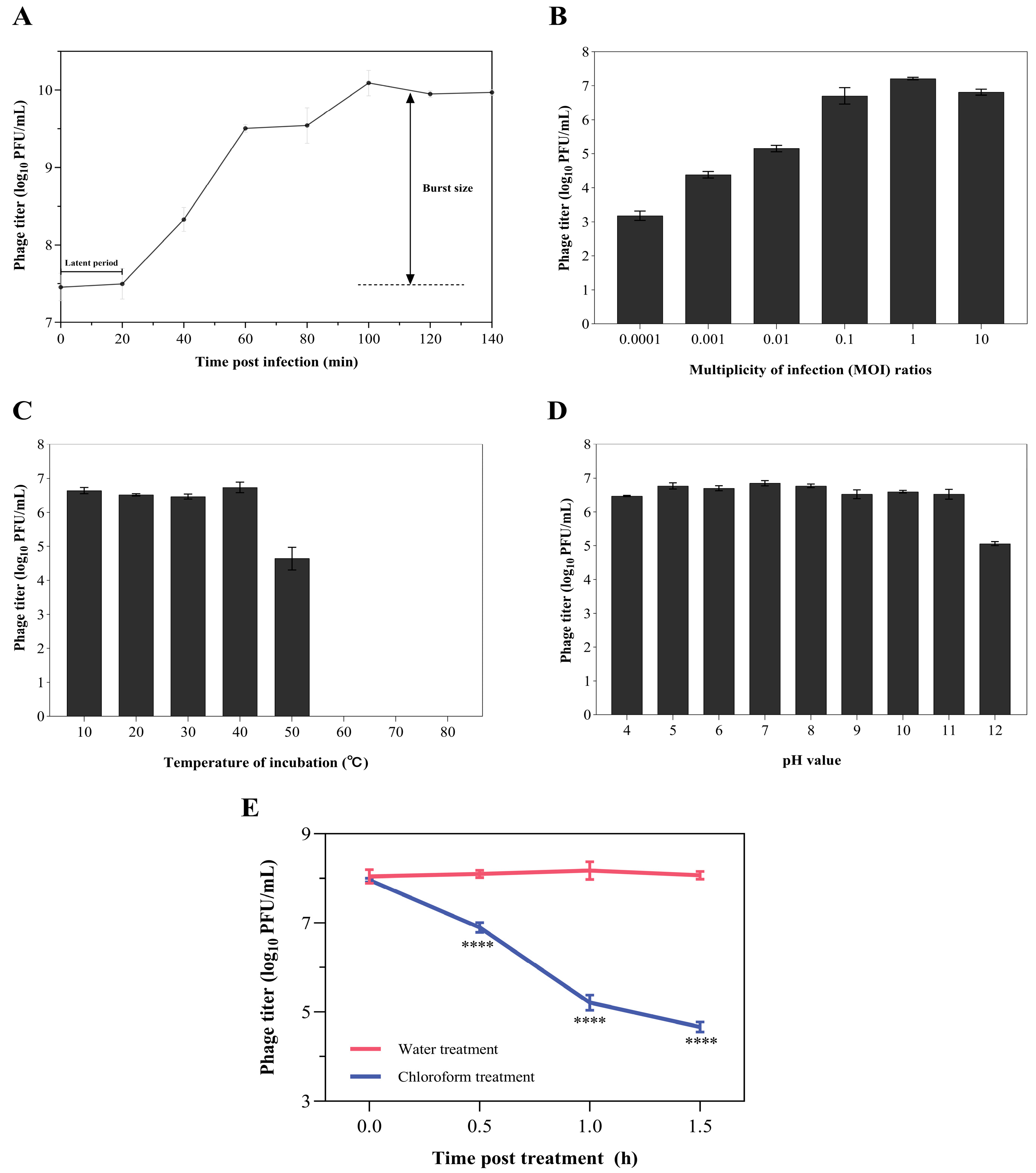 The temperature, pH, and chloroform stability of the phage Z90 particles were tested according to the method described by Cao et al. [59] with slight modifications. For the temperature stability assay, 1 mL of the phage suspension (in SM buffer, pH 7.5) was incubated at 10, 20, 30, 40, 50, 60, 70, and 80 °C for 1 h. For the pH stability assay, 100 μL of the phage suspension was mixed with 0.9 mL of phosphate-buffered saline (PBS) and incubated at pH 2.0, 3.0, 4.0, 5.0, 6.0, 7.0, 8.0, 9.0, 10.0, 11.0, and 12.0 at 37 °C for 1 h. For the chloroform stability assay, 1 mL of the phage suspension (in SM buffer, pH 7.5) was incubated with 50 μL of chloroform or water at 37 °C for 1 h. After incubation, the residual phage titer was determined. All experiments were performed using three biological replicates (n = 3).